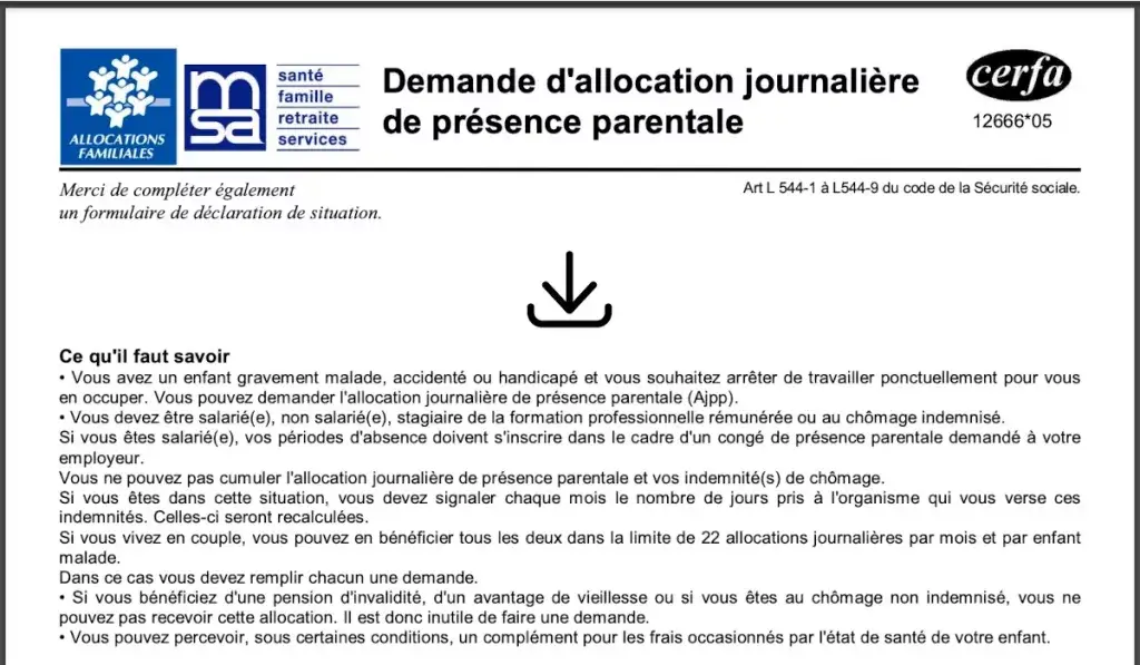 Le document officiel pour l’AJPP est le CERFA n°12666. Vous pouvez le télécharger directement sur le site de la CAF ou le retirer en version papier auprès de votre caisse. Pour les affiliés MSA, le formulaire reste identique, mais doit être transmis à votre caisse agricole. La version la plus récente du formulaire est la version *05, mais les versions *03 et *04 sont encore acceptées.
