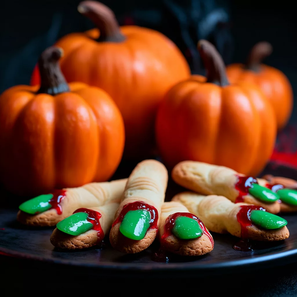 Vous voulez créer l’effet WOW absolu à votre table d’Halloween ? Cette version revisitée des doigts de sorcière avec leurs ongles verts brillants et leur sang qui coule fera sensation ! Le contraste entre le biscuit doré, le vert éclatant des ongles et le rouge profond du « sang » crée un effet visuel à la fois horrifiant et irrésistible.