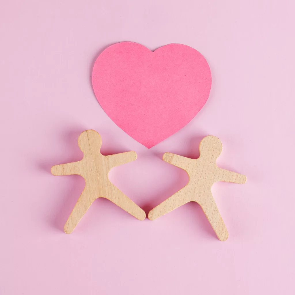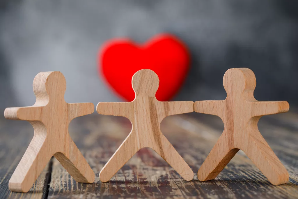Business and insurance concept with wooden figures of people, red heart on wooden and foggy background close-up.