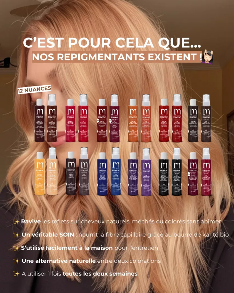 - Les soins repigmentants (crèmes ou masques) : ce sont de véritables traitements beauté pour les cheveux. Enrichis en pigments mais aussi en actifs nourrissants, ils redonnent éclat et nutrition en un seul geste. Leur texture est crémeuse, ultra-agréable, et les résultats sont visibles dès la première application.