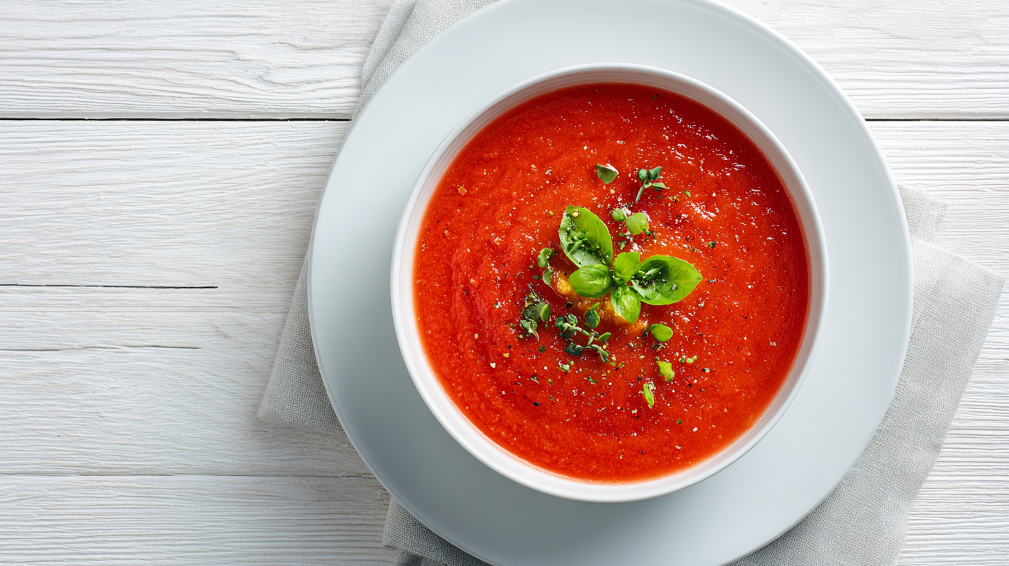 Servi bien froid, ce mélange coloré de tomates, concombres et poivrons incarne à merveille l’été méditerranéen. Sans cuisson, il conserve la totalité des vitamines, des fibres et de la fraîcheur naturelle des légumes. Arrosez-les d’un filet de vinaigre de Xérès, ajoutez un peu d’huile d’olive et quelques feuilles de basilic frais pour une explosion de saveurs estivales.