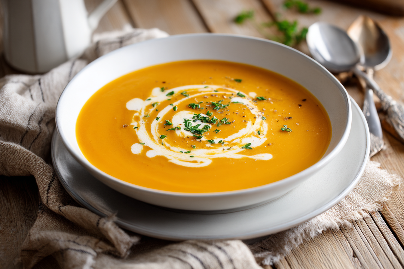 L’association du potiron et de la pomme de terre crée une base naturellement crémeuse et réconfortante. Enrichie de 200 ml de crème fraîche et relevée d’une pointe de muscade, cette soupe séduit par son équilibre entre douceur et rondeur. Le potiron libère ses sucres naturels au fil de la cuisson lente, tandis que la pomme de terre assure la liaison et donne de la consistance. Pour une texture parfaitement lisse, passez le mélange au mixeur plongeant avant un dernier ajustement d’assaisonnement.